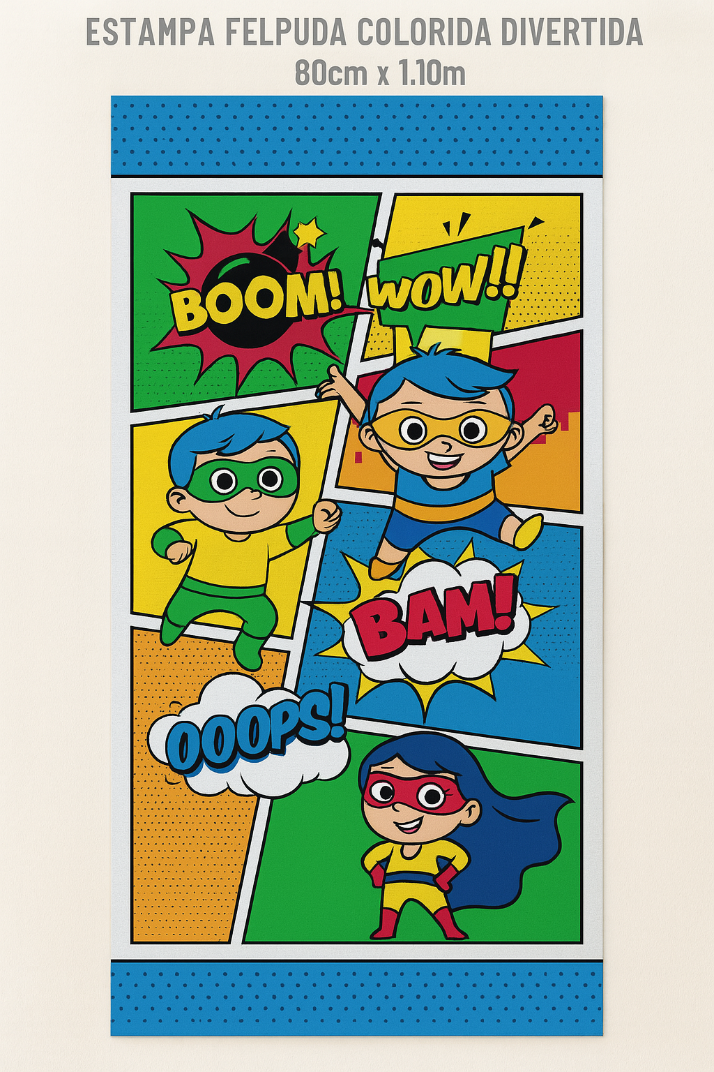 A toalha felpuda da coleção Super Poderes ilustra a temática divertida dos super-heróis, com elementos que remetem as histórias em quadrinhos como onomatopeias coloridas e fundos de diferentes padronagens. Ela possui o jeito Lepper, com um tecido que conta com a exclusiva qualidade da felpa que não desfia, possui ótima absorção e fica mais macio a cada lavagem. A hora do banho ou saída da piscina dos pequenos pode ser mais alegre, mais lúdica, mais Lepper!